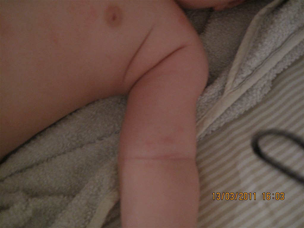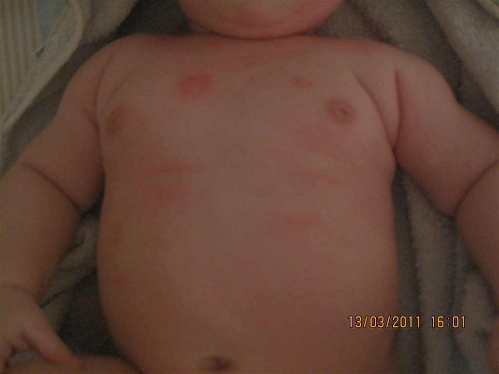 Den mørkerøde plet på brystet er en rigorm som er under behadling.