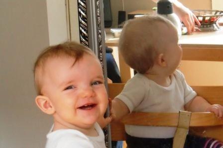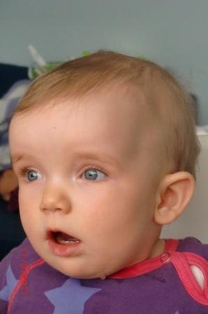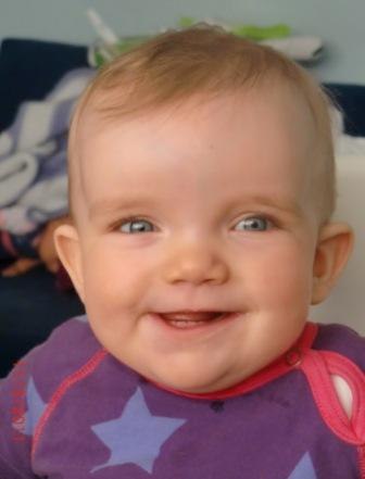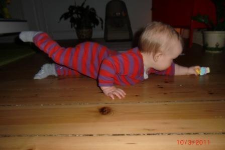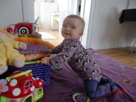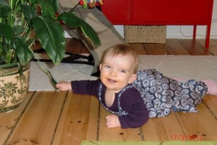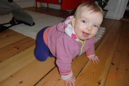 Hun er 9,5 måned gammel og udvikler sig i rivende fart. Hun er en rigtig lille frækkert og møver rundt nu i hele huset og undersøger alt i sin nærhed...potteplanter pilles ved og ledninger er også interessante. Jeg har travlt med at flytte, gemme og aflede