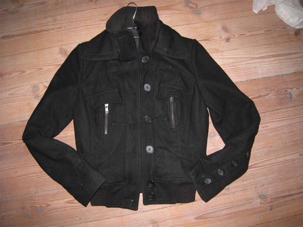 Sort kort jakke i sort uld, med knapper og lommer og dejlig krave med ribkant. Str. xs fra ONLY
