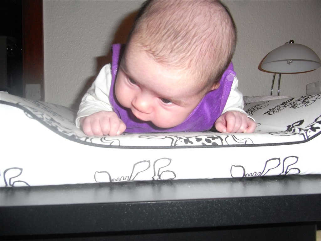 Ved fødslen for præcis 5 uger siden var hun 3670 g og 53 cm, og nu er hun 5040 g og 55 cm. Det er lidt i underkanten med længden, men jeg synes heller ikke lægen strakte hende helt ud, så både min mand og jeg er enige om, at hun sikkert er 1 eller 2 cm længere, men det tager vi nu ikke så tungt! Så længe hun trives - og det må man sige, hun gør - hun har da taget 1370 g på siden fødslen!