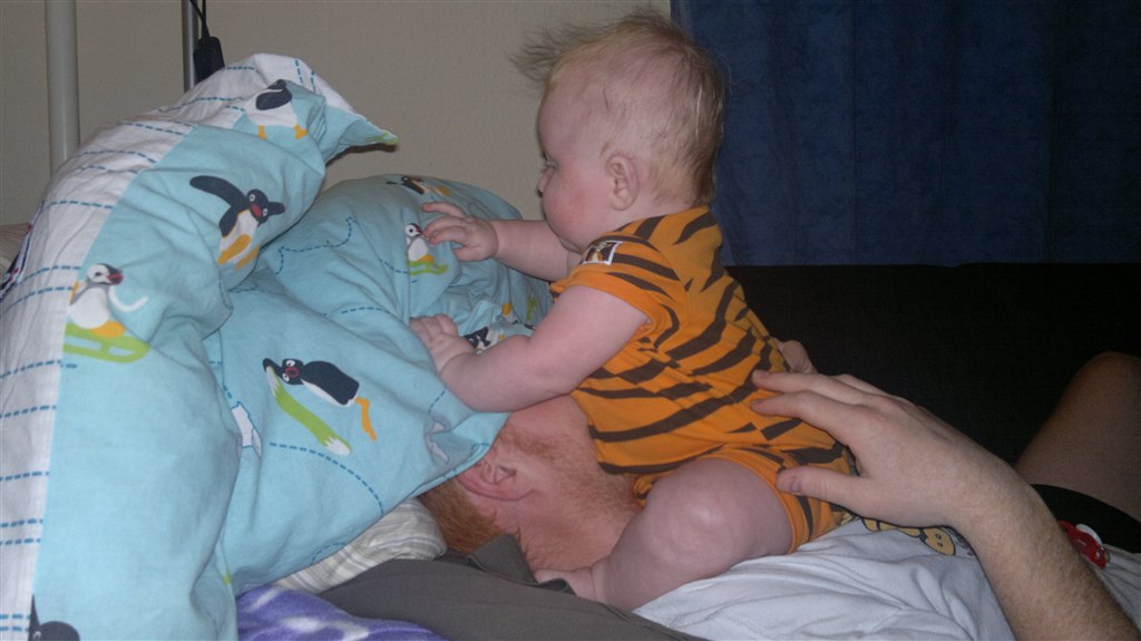 dukke skriver: Aksel i bad og leger med sin far han bliver 5 mdr på lørdag