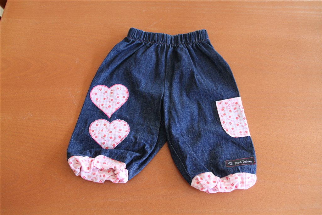 Bukser i blød denim med hjerteapplikation og en lille lomme fra Daub Deluxe str. 68. Brugt 1-2 gange. 60 kr.