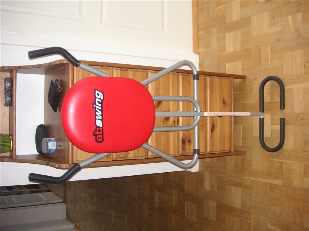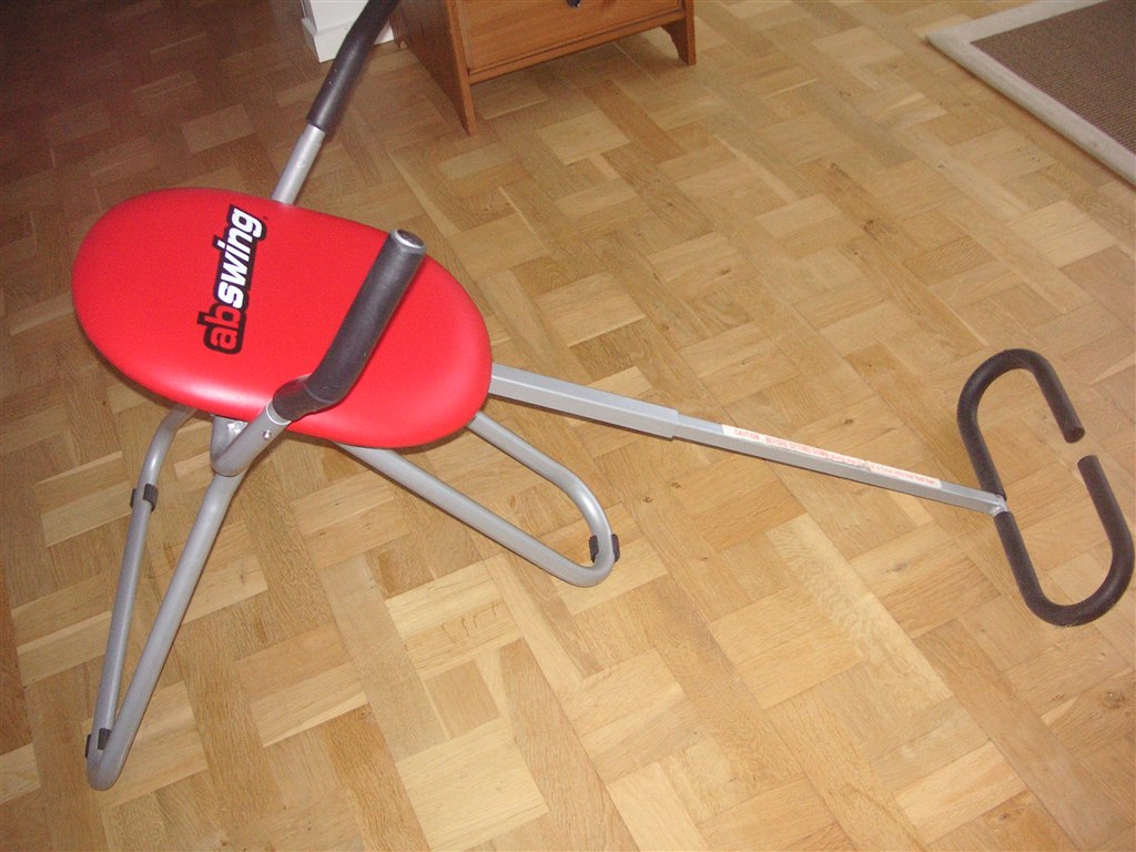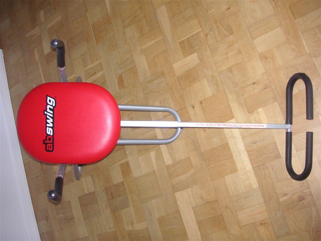 Kristine skriver: Hmmm, svært af forklare, men man sidder/læner sig op af det røde sæde, og sætter benene ned i bøjlen mens man tager fat i håndtagende. Herefter svinger man benene op og ned. Den kan naturligvis indstilles for benlængde. Den virker godt.
