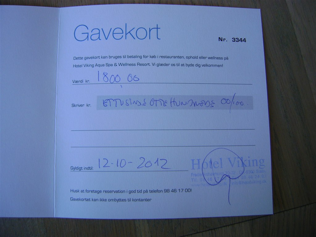 Har et gavekort til Hotel Viking ( Sæby , Nordjylland ) på 1800 kr til selvvalg brug.